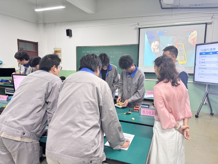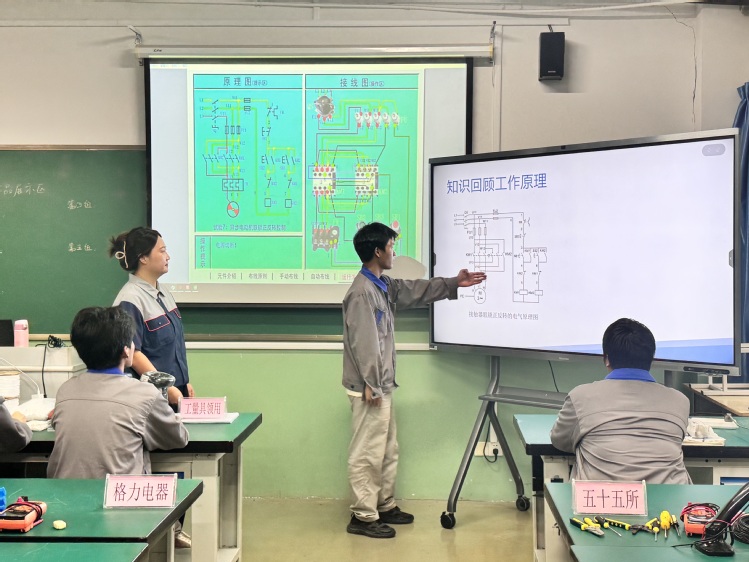课堂上,两位老师配合默契,巧妙融入思政元素,以工学一体化教学模式为核心,深度融入企业实际工作任务,创新设计学生角色扮演环节。从元器件质量检测、I/O分配表绘制,到PLC外部接线图规划、梯形图程序设计,全程采用分组PK形式激发学生积极性,同时借助AI技术赋能教学,引导学生在动手实践中主动探究、深度思考,切实提升解决实际问题的能力。此外,通过仿真模拟演示与实物接线通电测试相结合的方式,直观呈现学生学习成果,课堂互动氛围热烈浓厚,取得了很好的教学效果。