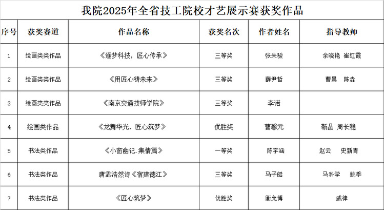 绘画类中,张朱骏《逐梦科技,匠心传承》、薛尹哲《用匠心铸未来》、李诺《南京交通技师学院》获三等奖,曹馨元《龙舞华光,匠心筑梦》获优胜奖;书法类里,陈宇涵《小窗幽记·集情篇》获一等奖,马子皓书《宿建德江》获三等奖,衡允博《匠心筑梦》获优胜奖。
