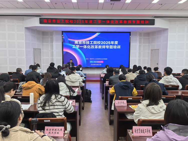 10月24日下午,南京市技工院校2025年度工学一体化改革教师专题培训圆满结束。本次培训为期4天,由南京市人社局主办,我院承办,来自南京市10所技工院校的52名教师参加了培训。本次培训邀请了南京技师学院朱胜强副院长、南京交通技师学院刘明军副院长、宋云波副院长以及省教师职业能力大赛金牌教师蒋延莲担任培训专家。