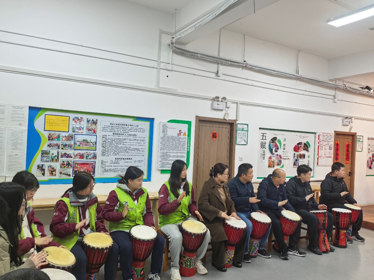 活动现场,志愿者们参与残疾人朋友精心准备的非洲鼓演出。演出前,老师热情地向志愿者们讲解非洲鼓的基本演奏技巧,志愿者们认真学习、积极互动,很快融入到演出氛围中。随着欢快的节奏响起,志愿者与残疾人朋友共同敲击鼓面,整齐的鼓点、昂扬的旋律传递出乐观向上的精神力量,现场掌声与欢呼声不断。这场特殊的演出不仅展现了残疾人朋友积极进取的精神风貌,更见证了党团员与残疾人朋友之间的深厚情谊。