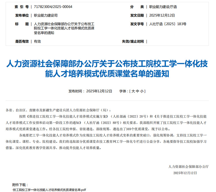 近日,学院工学一体化建设连续取得重要成果。根据人力资源和社会保障部最新公布的消息,学院申报的《比亚迪e5动力蓄电池系统检查与维护》《企业门户网站业务迁移公有云》两门课程成功入选“全国技工院校工学一体化优质课堂”。同时,电气自动化设备安装与维修、计算机网络应用、新能源汽车检测与维修三个专业,被人社部正式确定为“全国技工院校工学一体化第一阶段建设院校及建设专业”;汽车钣金与涂装、工程造价、现代物流三个专业,确定为“全国技工院校工学一体化第二阶段建设院校及建设专业”。这三项成果,标志着学院在深化教育教学改革、构建特色人才培养体系方面,实现了从专业布局到课程建设的系统性突破。