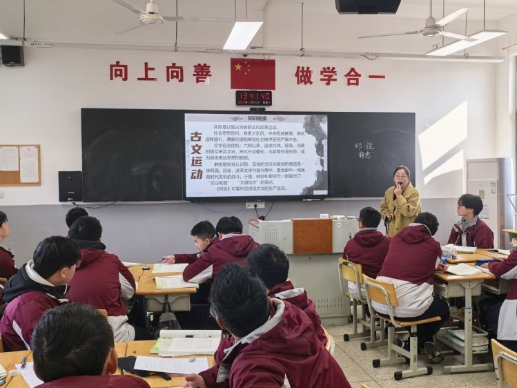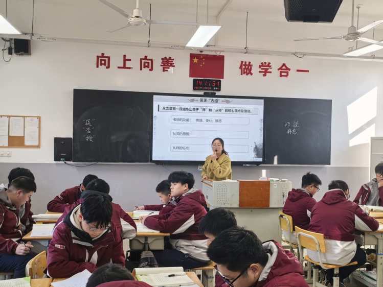 黄欣茹老师通过“识其人,晓其世”的情境教学法使学生了解作者韩愈在文学史上的地位并介绍了“古文运动”的背景以及对后世文学的影响。在“读文本,正音义”、“析文理,辨师道”等重点教学环节中,黄老师通过一以贯之的问题链,驱动课堂逐层推进,在各小组完成任务活动的过程中引导学生深入理解韩愈“不拘于时”的精神与“师道”的现实意义。