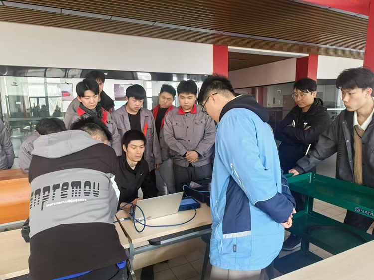 在理论教学环节,冯老师系统讲解了Tesla电路图设计特点、CAN通信网络架构以及车门控制系统等核心知识。为提升教学效果,冯老师创新采用互动式教学方法,鼓励学生主动展示学习成果,有效激发了学生的学习热情与参与积极性。在实践操作环节,冯老师将学生分为三个小组,分别开展CAN信号检测、车门总成拆装等专业技能训练,并在实训过程中,耐心解答学生疑问,确保每位学生都能掌握操作要领。