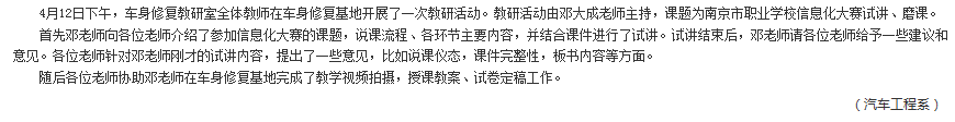 3 | 汽车维修综合实训 | 宋云波 | 16汽修中专(7)(3+3) | 良 | 版面设计、集训基础视频、题库建设、任务点均已完成建设,并在集训过程中正常使用,目前正进行理论题库的组建,并进行考核试卷的出题测验操作 |